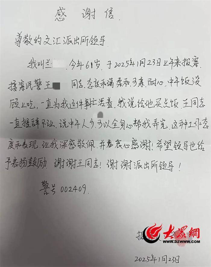 推行了近2个小时后,终于留出了足够大的空间,现场民警指挥李女士调整方向,车辆成功驶出后才放心离去。一封“按手印”的感谢信2025年1月23日中午,兰女士在某商铺购物时因一时疏忽导致手机丢失, 值班辅警王宏伟正要换班去吃午饭,看到兰女士焦急的样子,他立即接下报警详细了解情况,并抓紧时间调取商铺附近监控追查嫌疑人。